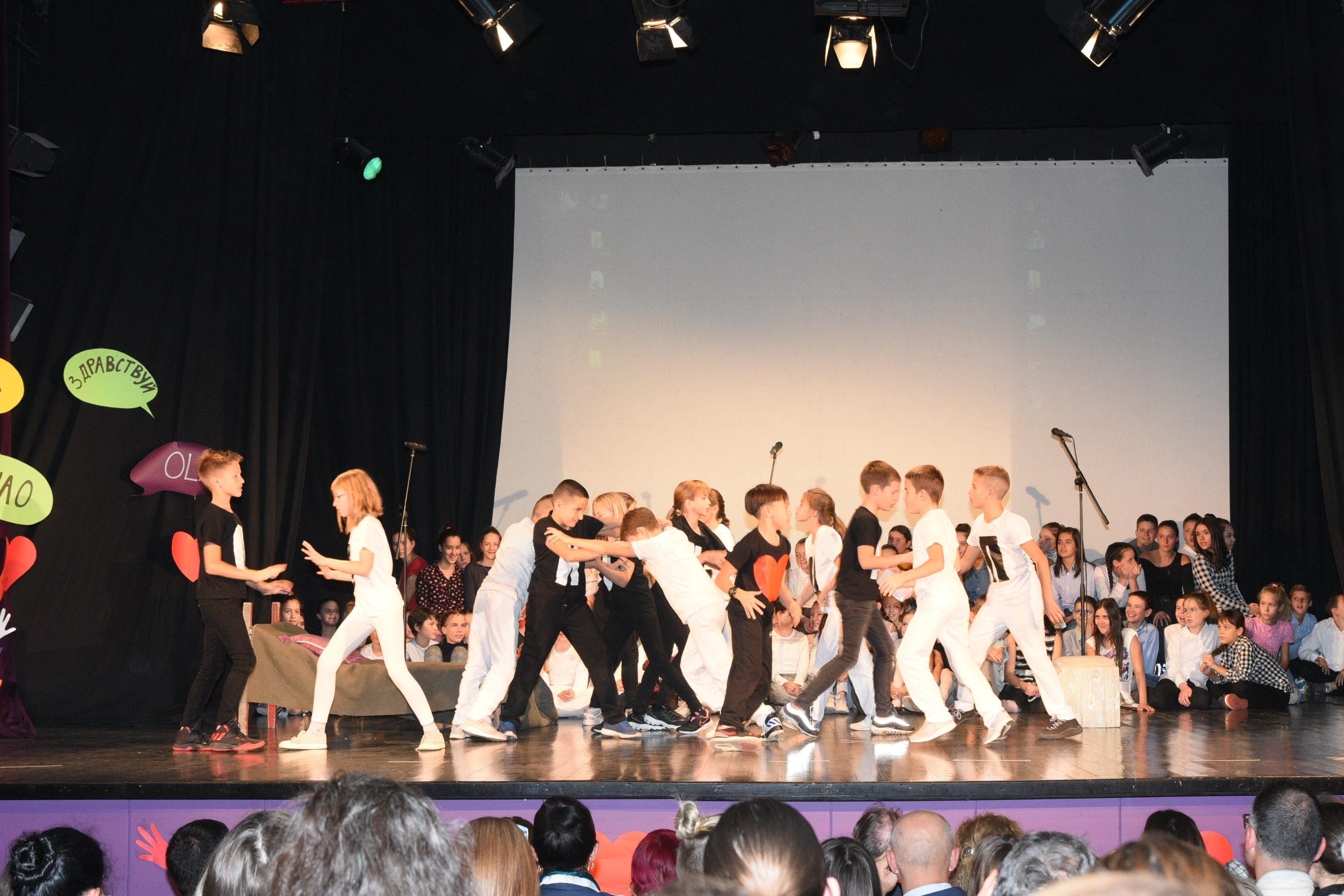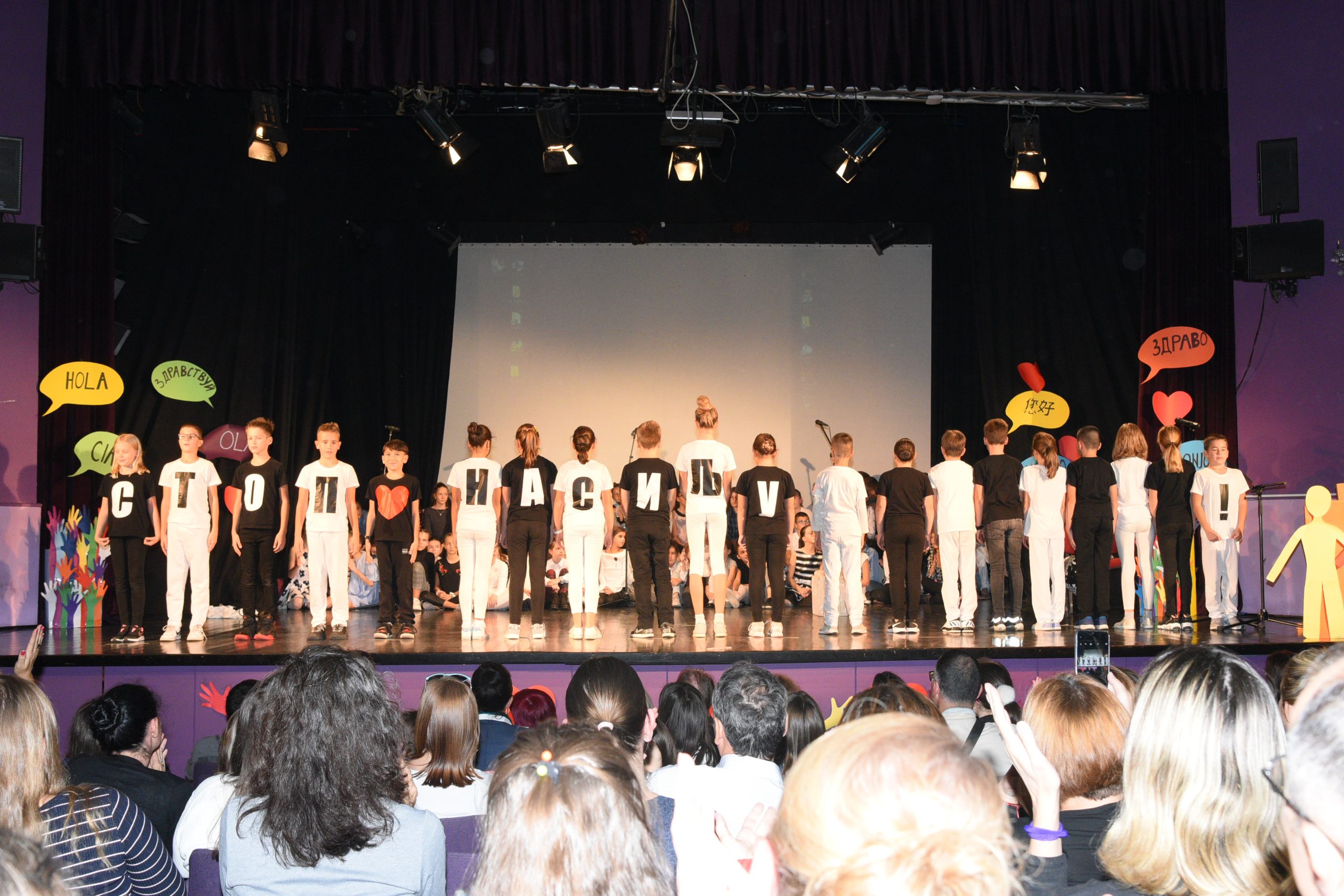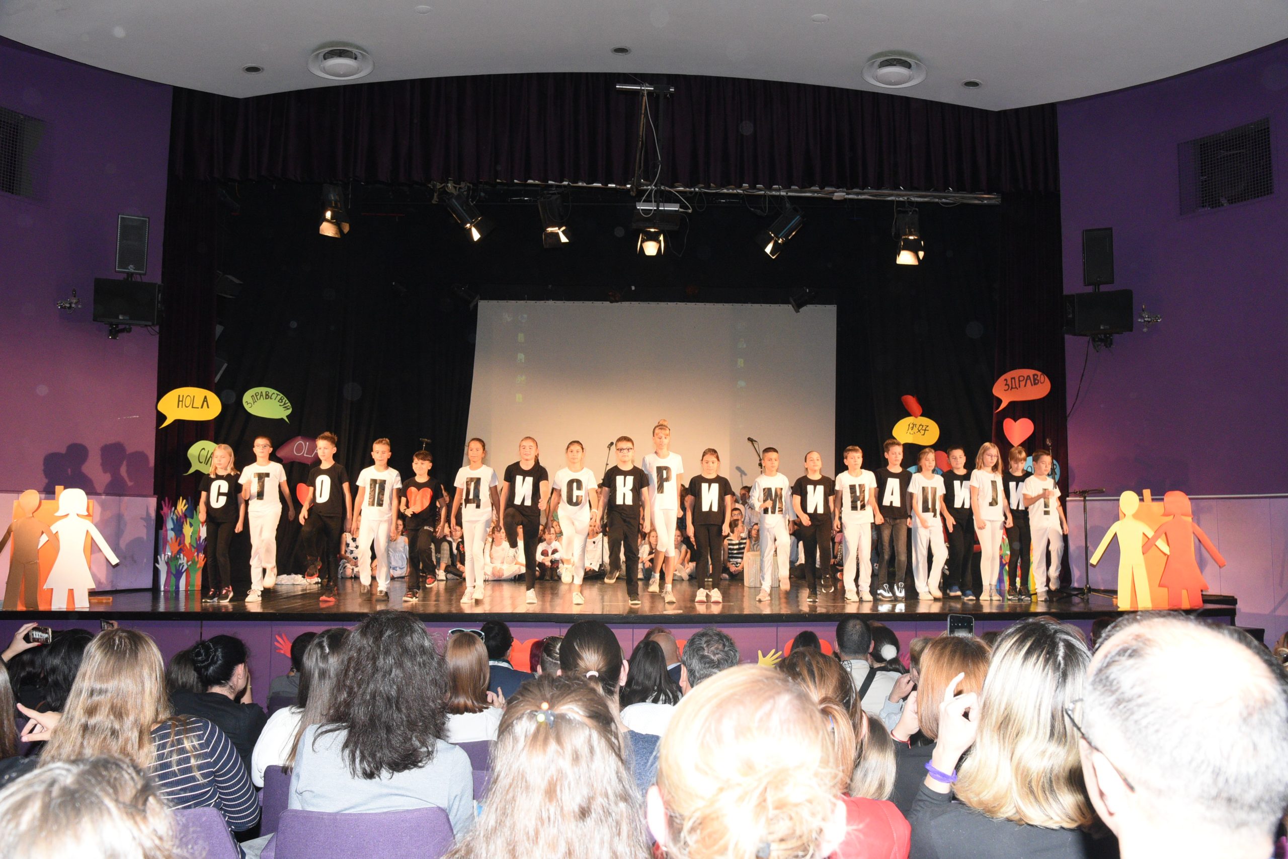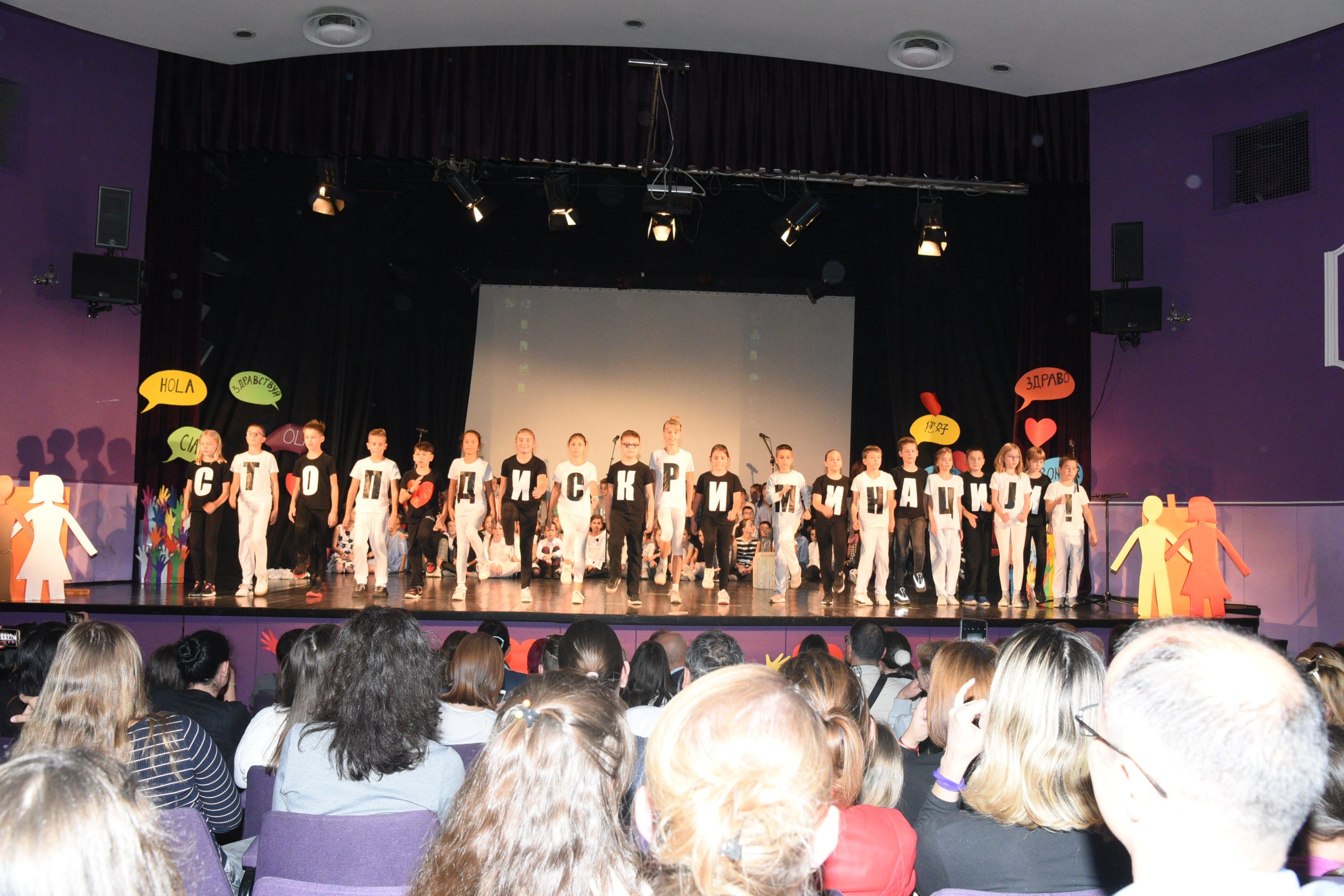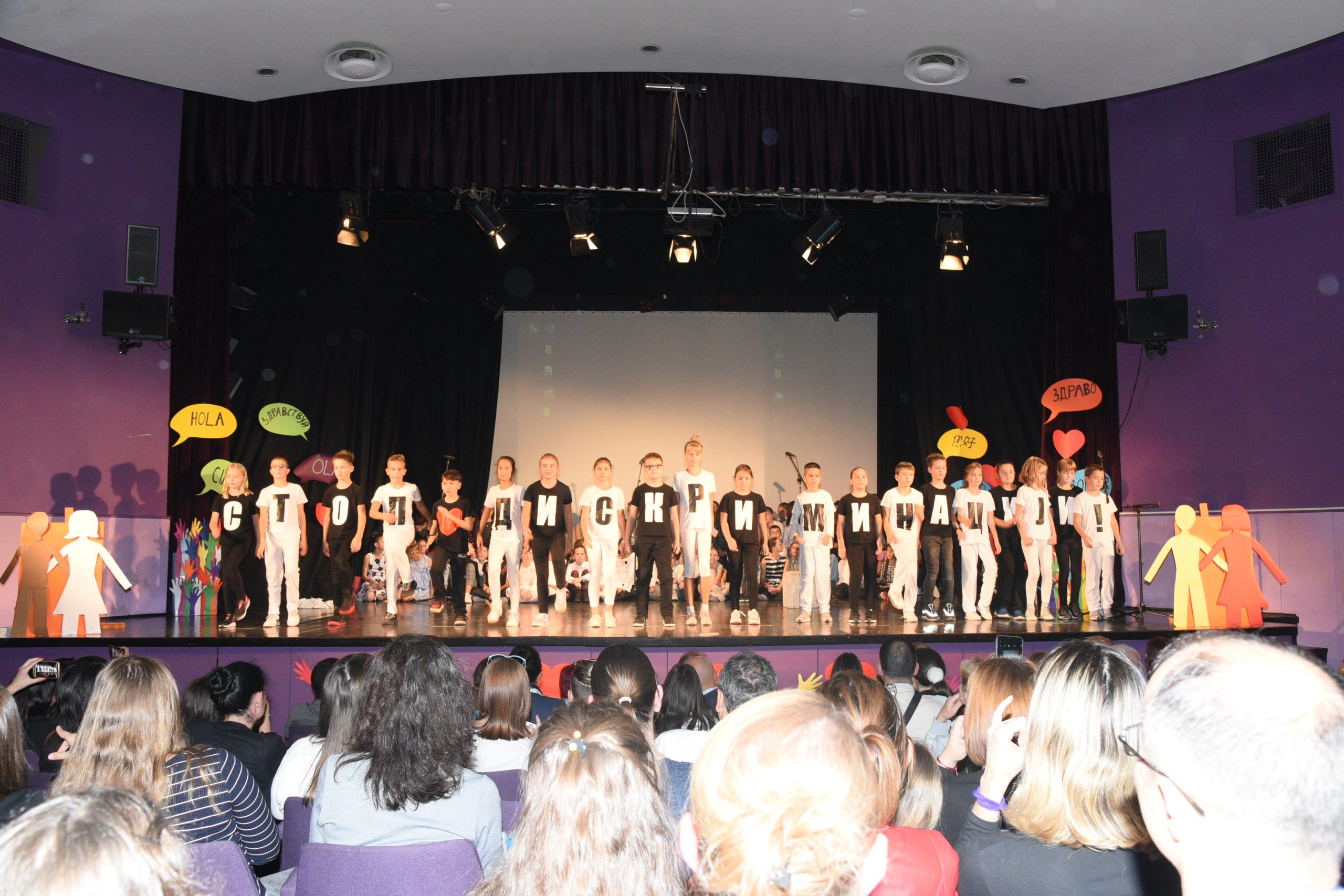 Музичко сценски приказ Стоп дискриминацији- стоп насиљу рађен је за потребе Дана школе чија је тема била Толеранија и пријатељство. Приказ је на основу покрета и музике хтео да дочара животне ситуације у којима се деца често налазе, али не успевају увек да их заобиђу. Сам приказ показује и улогу одраслих у решавању појединих проблема у којима се деца нађу.