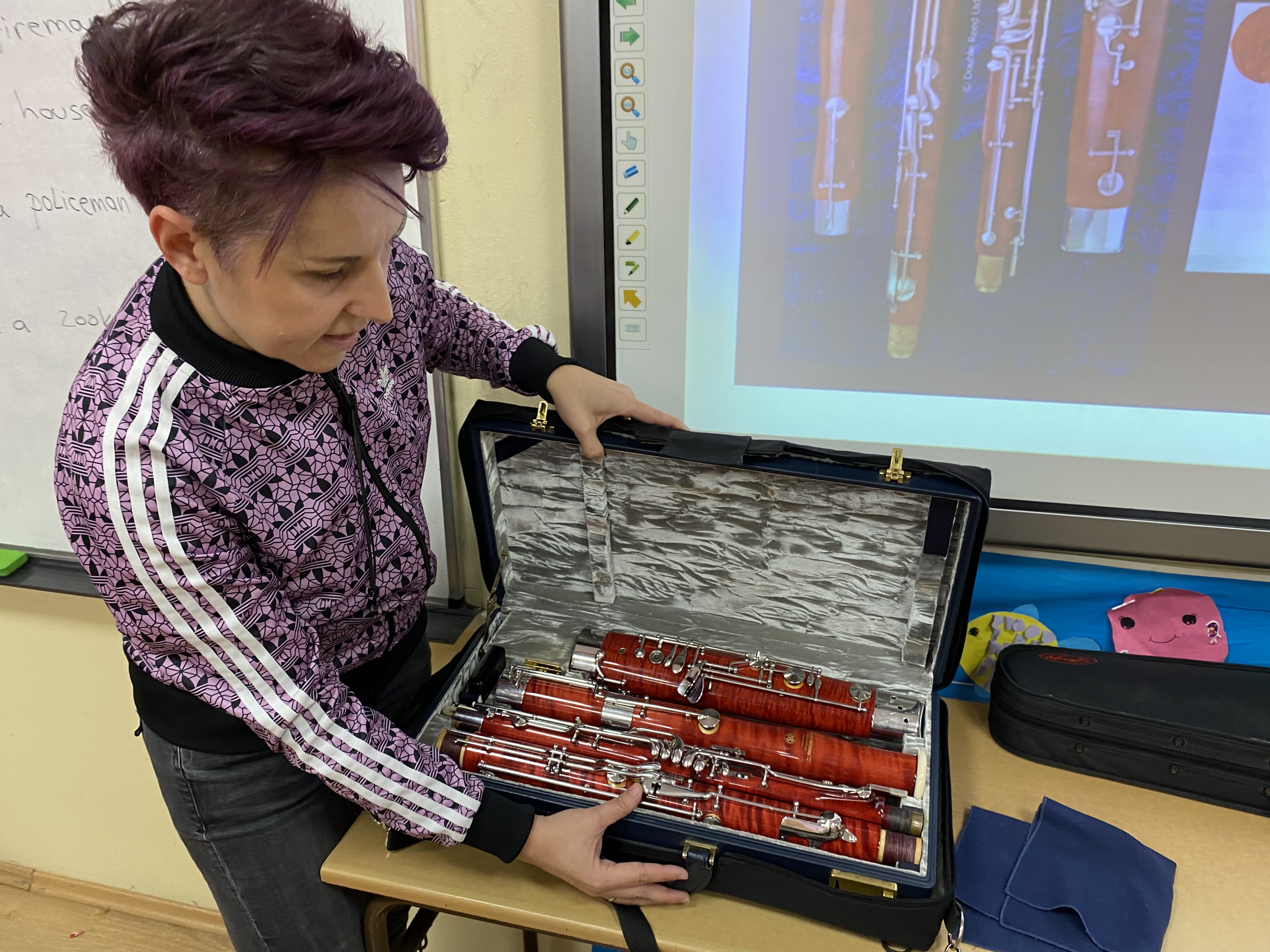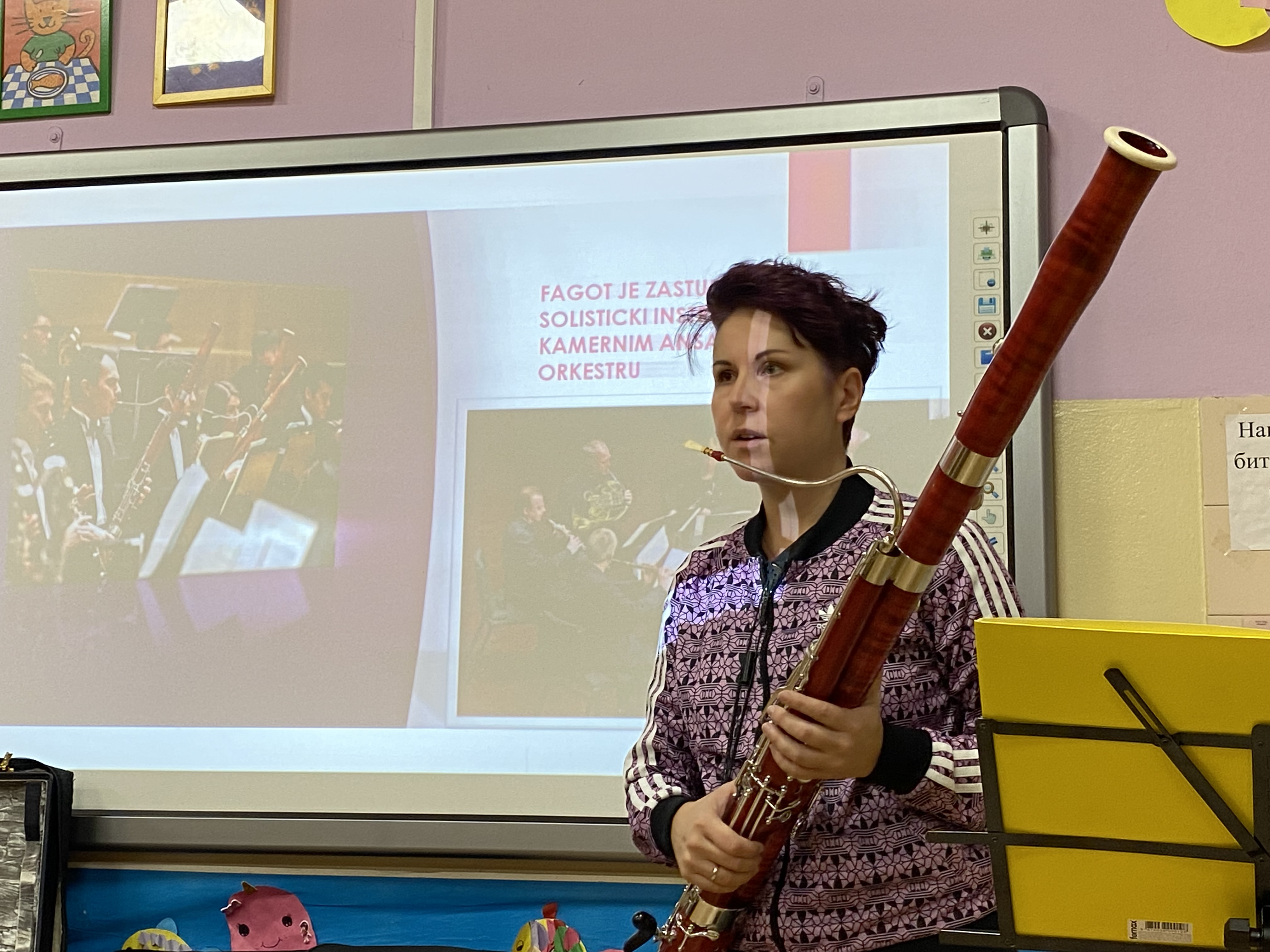 U okviru projekta Roditelj predavač u gostima nam je bila Ana Đorđević Merle koja je predstavila svoje zanimanje- fagotista. U okviru časa, kroz prezentaciju prvo je predstavila svoj instrument, kao i violinu koja je na času bila gostujući instrument. Izvela nam je nekoliko kompozicija samostalno, a nakon toga i sa svojom ćerkom Teodorom Merle, kao i kolegom violinistom sa kojim je odsvirala nekoliko kompozicija. Prikazala je i kratak film koji je snimila u Narodnom pozorištu, kako bi prenela deo atmosfere pred koncert i na probama. Razgovarano je i o pravilima ponašanja na koncertu, kao i o toaleti koja se tada oblači. Čas je završen kompozicijom ,,Mala noćna muzika” koja je obradovala sve učenike.