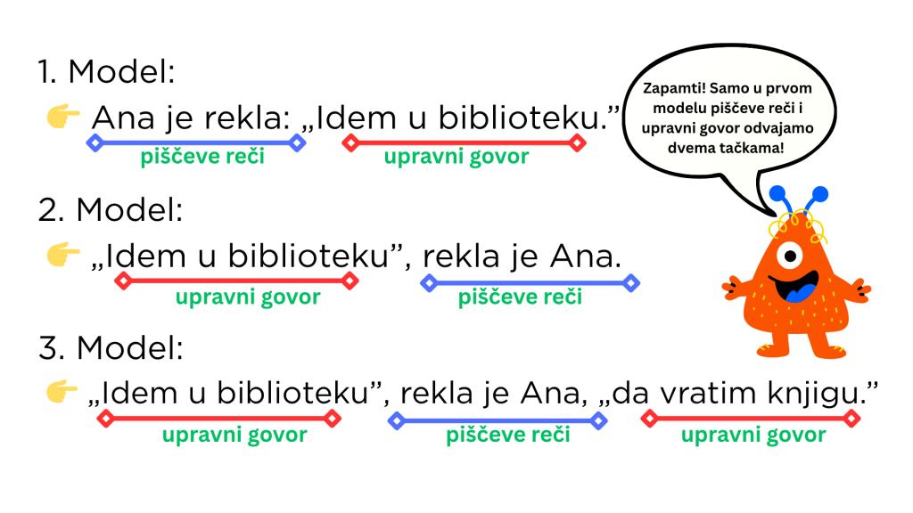 Tokom svog rada primetila sam da dosta dece teže usvaja pravila pisanja upravnog govora. Iako naizgled jednostavan, ovaj deo pravopisa ume da zbuni, naročito kada treba zapamtiti gde idu navodnici, zarezi i delovi upravnog govora.